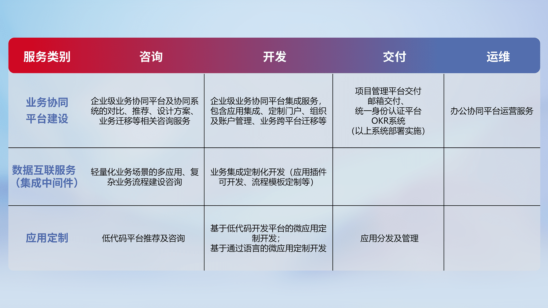 针对钉钉、、、企微、、、、IDaas等平台级产品提供产品的规划、、、、方案、、、、交付、、、定制化开发等服务,,,实现如统一协同办公、、智能客户服务、、、、混合会议管理、、、、智能数据查询、、等业务场景,,,,实现数字化转型。。。。